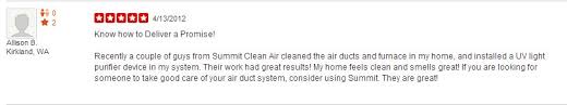 ↓ Skip to Main Content “Recently Summit Clean Air cleaned the air ducts in my home. The technician and his helper were courteous, clean, did a good job, but most impressively, they were willing to explain the process patiently, and left me with great understanding of what is required to keep up a clean and well performing system. You can’t lose with these guys!” “Next time you need your air ducts cleaned, check out Eastside’s Summit Clean Air. It felt like their technicians cared more about my air ducts than I did! They fussed on details and insisted on explaining. I now have very clean ducts, and know how to keep them clean. They broke the mold after they made those guys! I highly recommend them!” “I invited Summit Clean Air to clean the air duct in my home. Their technicians were fantastic. They did the work thoroughly and very professionally! The air coming out of my ducts now is odorless and clean. Thumbs up to these hardworking and courteous guys!”