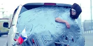 This will ensure a shard doesn't fall out and cut you. and tape up all around the damaged area. It will prevent glass from shattering on the inside until it can be fixed. Duct tape by itself will hold out. TIRES STUCK IN MUD/SNOW – Look around the car for bulk such as sticks, boards, even-side road garbage (paper plates, etc), and duct-tape together to create something at least 2 feet long (for the two main tires - rear or front tires depending upon rear wheel or front wheel drive) for the tires to grab onto to get out of the rut. Always rock the vehicle when getting out of icy situations. Don't just let the tires spin as it will dig your car deeper into a rut. Blankets are also good for this. Bunch it together with duct tape so it stays thick and together. FIRST AID – Duct tape can act as bandages, slings, used for splints, in rare cases, tourniquets. You can make a cup for water, or temporarily tape skin back together should there be a deep cut. REPAIR LIGHTS – If someone just backed into your car and smashed the taillight!